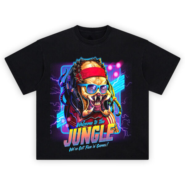 Inspired by the 1987 classic jungle warfare thriller, this vibrant design pairs 80s synthwave flair with one of the most iconic alien creatures in movie history. The text “Welcome to the Jungle” nods to both Predator’s wild setting and the legendary Guns N’ Roses anthem, giving this shirt double the nostalgia power.