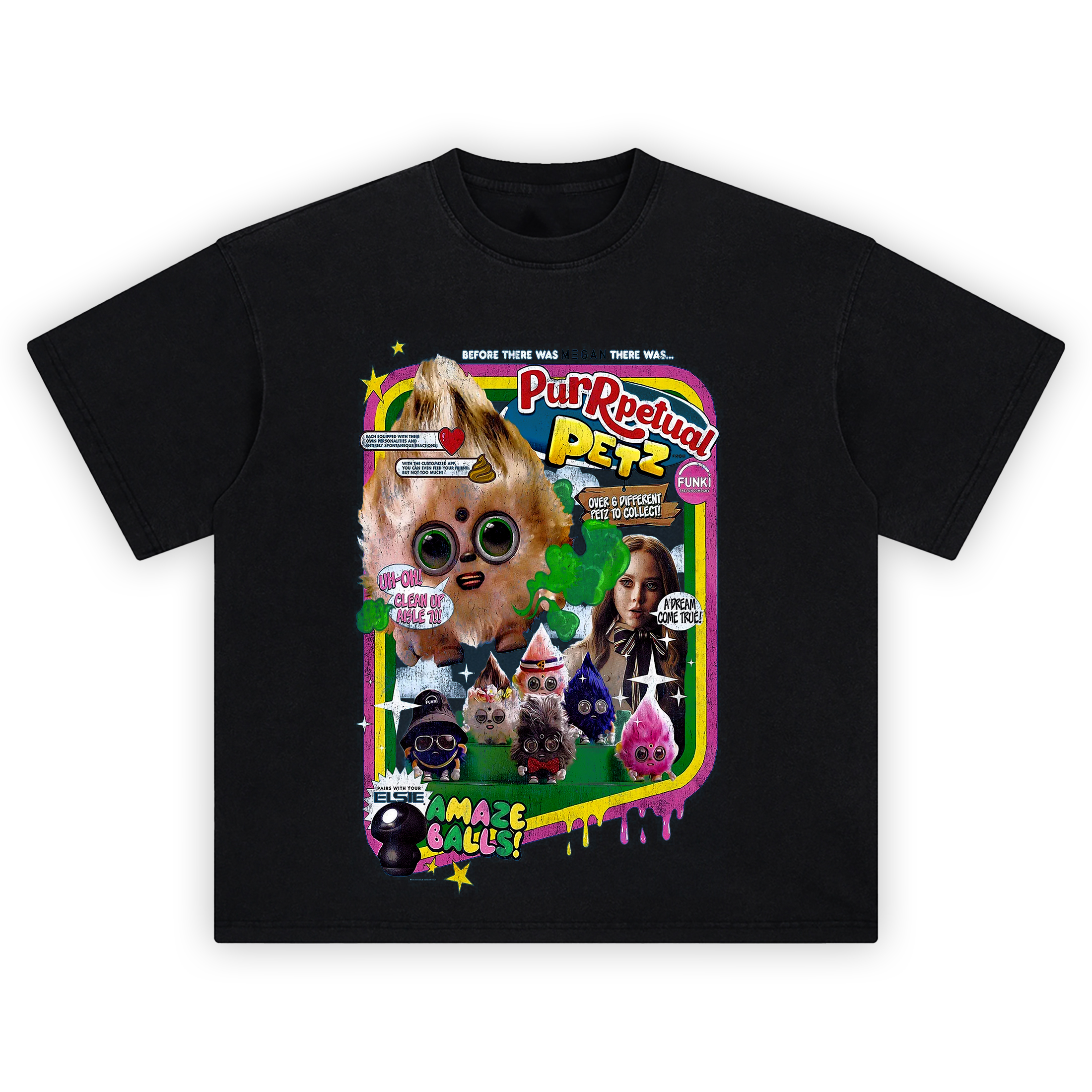 Add a hilariously creepy twist to your wardrobe with the Purrpetual Petz Parody Toy Graphic T-Shirt—a brilliant mashup of 90s toy nostalgia and modern horror satire. This tee takes a darkly comedic jab at those fuzzy robotic “pets” you remember from childhood, reimagined with a sinister smile, glitchy quirks, and an undeniable nod to the MEGAN universe. It’s all sunshine and sparkles… until things go totally off the rails.