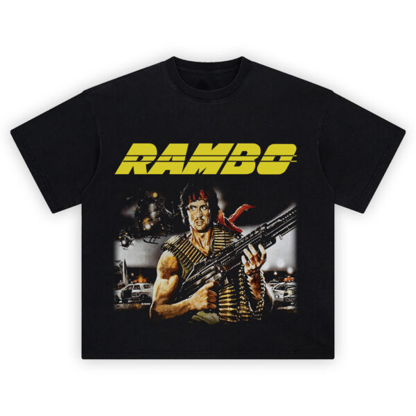 Rambo T-Shirt showcases Sylvester Stallone as the legendary action hero John Rambo in an explosive, high-octane design straight from the 80s. With bullets strapped across his chest, a red headband, and heavy artillery in hand, this shirt is a tribute to one of the most iconic action films ever made.