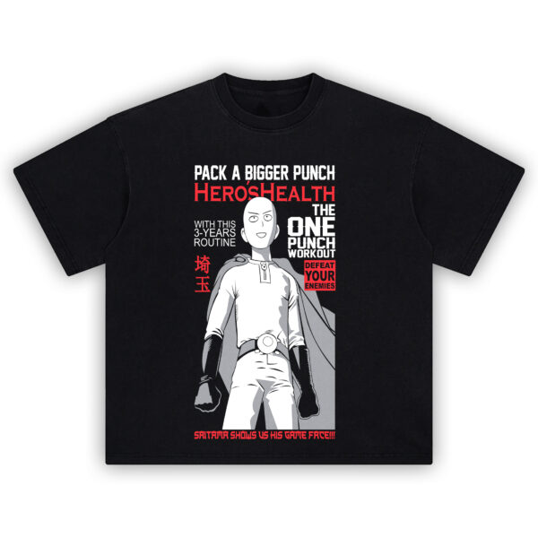 Train like the strongest hero alive with the Saitama Hero Workout Tee, a must-have for fans of One Punch Man and anime-fueled fitness. Featuring the legendary 3-year routine that turned an average guy into an unbeatable force—100 push-ups, 100 sit-ups, 100 squats, and a 10km run daily—this shirt brings both inspiration and intimidation.