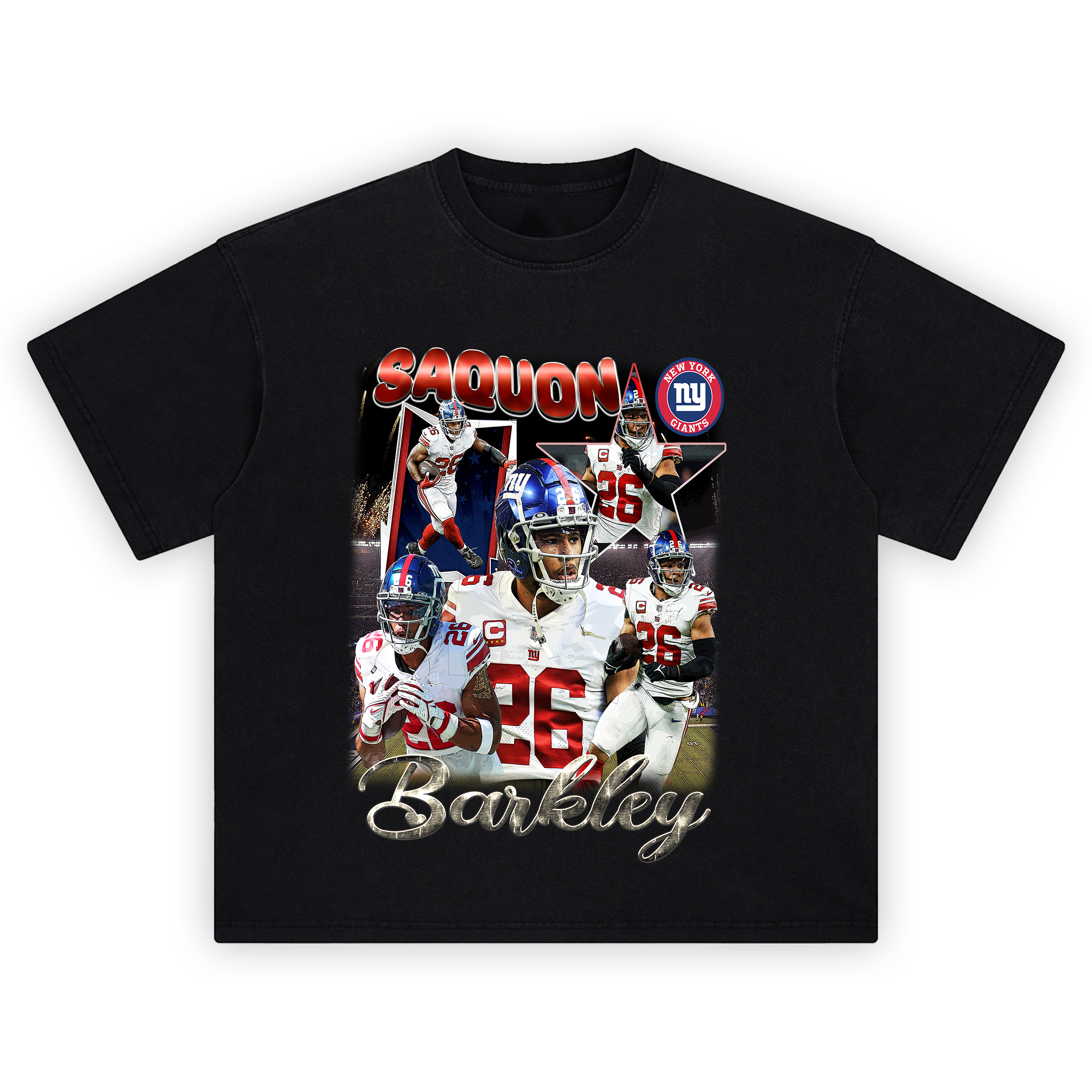 The Saquon Barkley New York Giants Graphic T-shirt is built for fans who crave explosive runs, electric jukes, and that signature #26 energy. Featuring a high-octane collage of Saquon in action and layered with the Giants’ red, white, and blue—this graphic tee blends intensity and tradition with superstar flair.