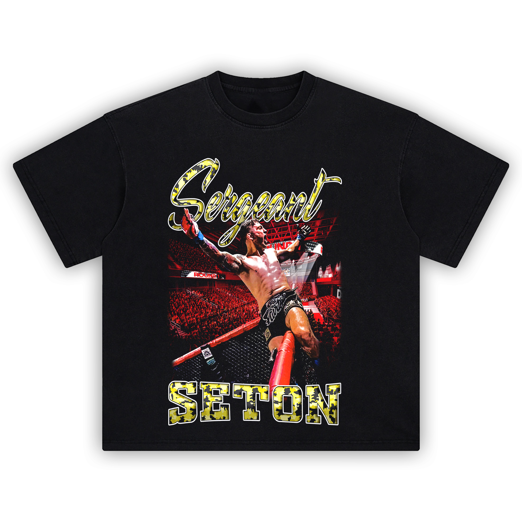 Dominate like a warrior with the Sergeant Seton T-Shirt, a bold tribute to the relentless energy and electrifying moments of Seton’s rise in the cage. Featuring an adrenaline-packed graphic of Sergeant Seton in his element—arms raised, crowd roaring, lights blazing—this graphic tee captures the thrill of fight night.