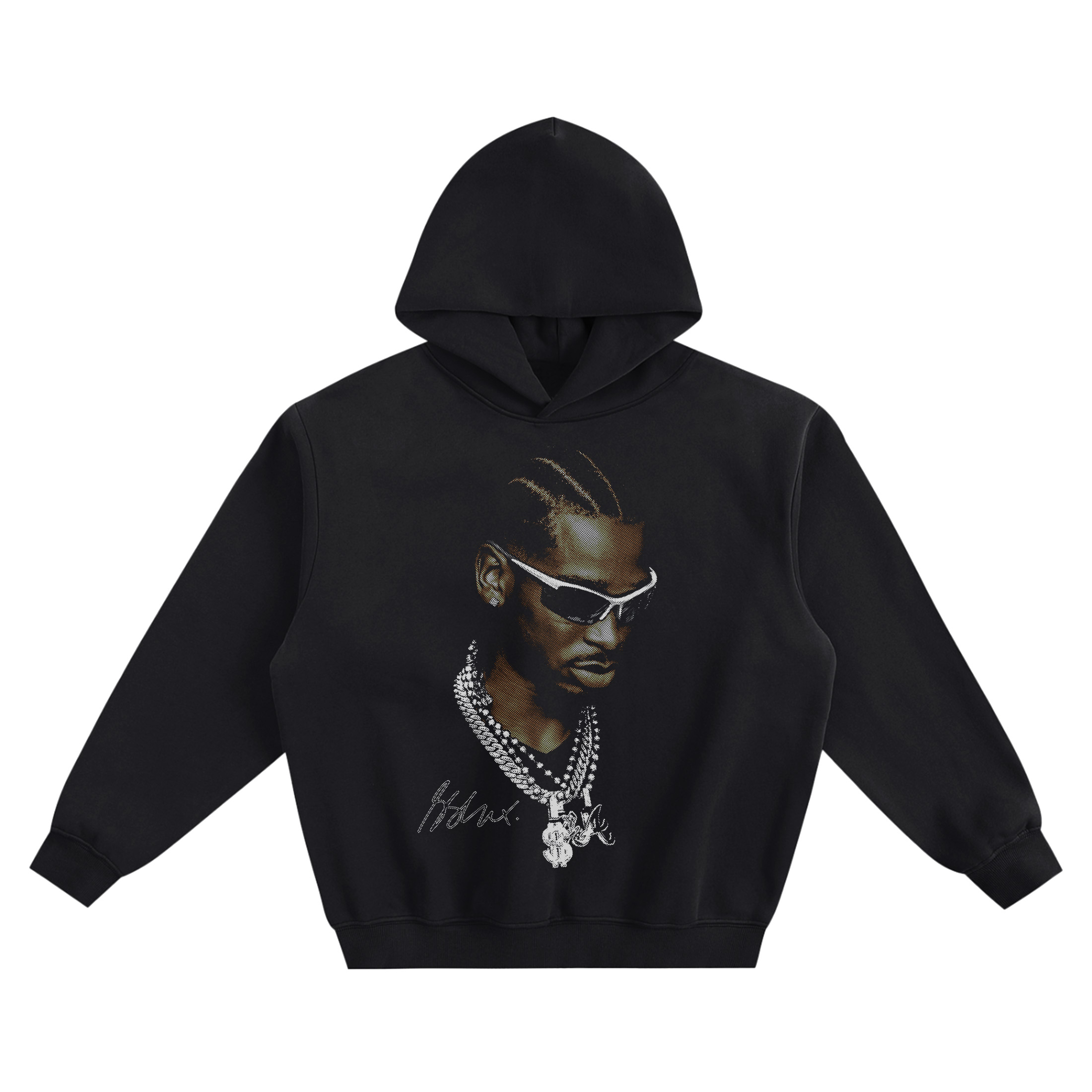 Bring elite energy to your rotation with the Shai Gilgeous-Alexander Braids Shades Big Face Hoodie—a portrait graphic built around confidence, detail, and clean presence. The front artwork features a three-quarter close-up of Shai Gilgeous-Alexander, angled slightly downward with a focused expression that keeps the mood serious and sharp. The portrait is framed to highlight the face, jawline, and the slick styling that makes the graphic feel instantly recognizable.