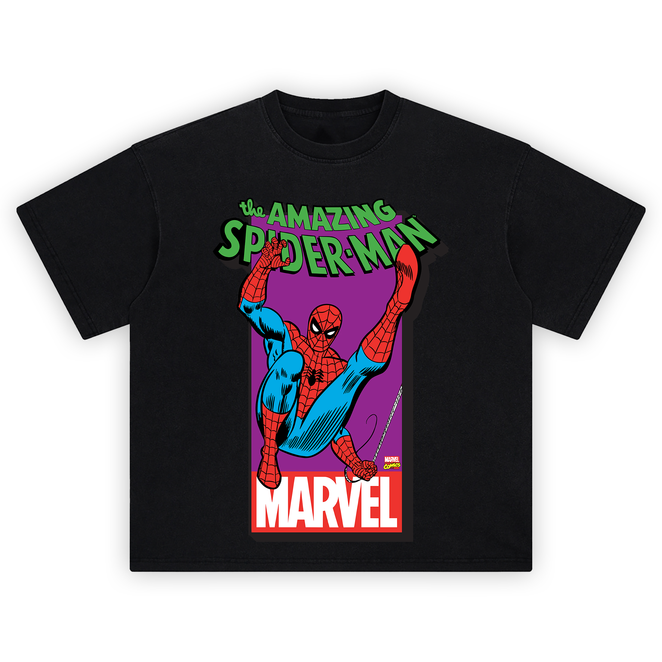 The Spider-Man Classic Marvel Graphic T-shirt snaps right out of a comic panel with wall-crawling momentum and web-slinging heat. Featuring the legendary Spidey suspended mid-swing on a vivid purple backdrop, this design pops with bold red webbing, blue suit contrast, and classic blocky green “Amazing Spider-Man” typography that oozes retro flare. Below, the iconic red-and-white Marvel logo anchors the frame like a stamp of timeless authenticity. Every line hits sharp thanks to DTG printing that captures the grit and glory of the golden comic era.