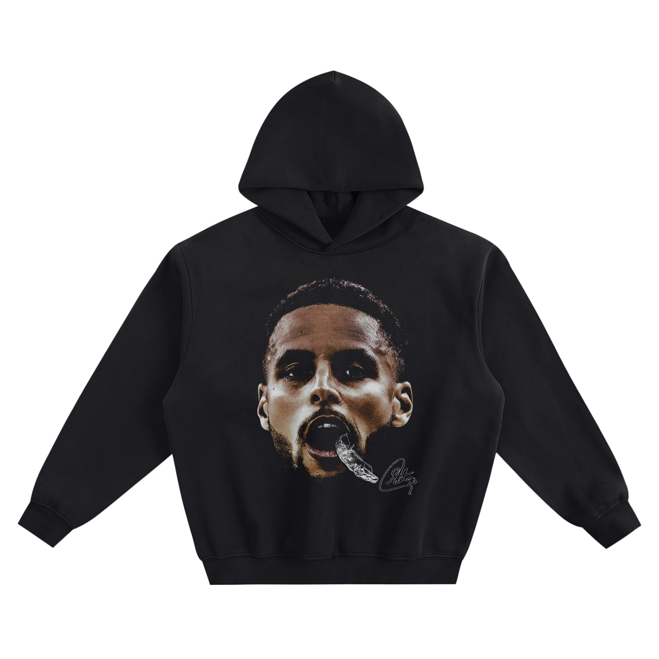 The Steph Curry Big Face Hoodie is built around a single, instant-recognition portrait—pure intensity, captured mid-moment. Centered on the chest is a close-up of Steph with his eyes locked forward and his mouth open like he’s calling a play, reacting to a shot, or feeding off the crowd. The standout detail is the mouthguard hanging out, giving the image that unmistakable “Curry in his zone” feel that fans know in one second.