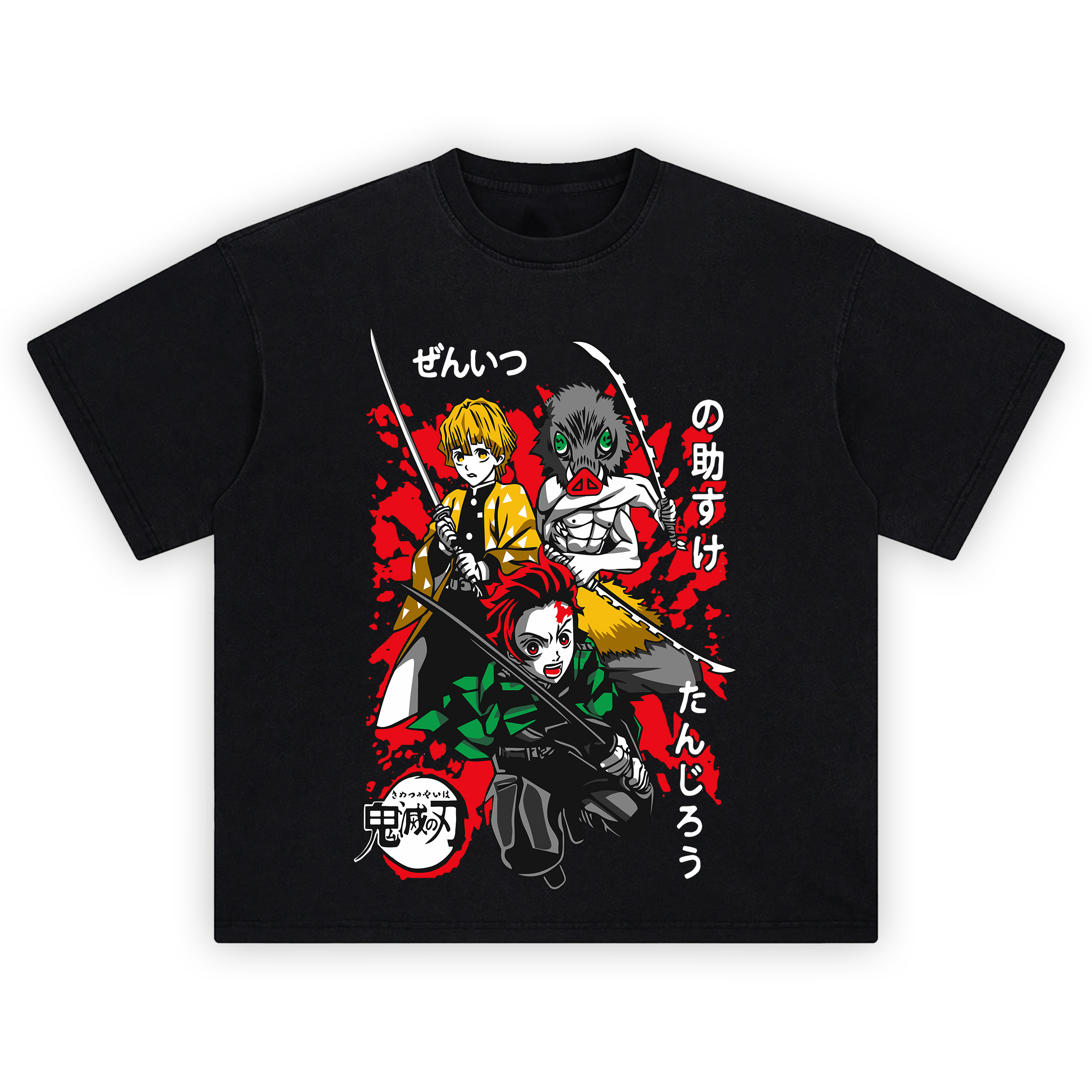 Charge into action with the Tanjiro Zenitsu Inosuke Trio T-Shirt, spotlighting the unstoppable trio from Demon Slayer: Kimetsu no Yaiba. This design captures Tanjiro in mid-attack, Zenitsu ready to strike, and Inosuke charging in with his dual blades—each rendered in vibrant, anime-accurate colors against a bold red splatter background. Japanese text highlights their names, adding an authentic manga-style touch. Whether you admire Tanjiro’s resolve, Zenitsu’s hidden strength, or Inosuke’s fearless chaos, this tee unites them all in one fierce design. The Tanjiro Zenitsu Inosuke Trio T-Shirt is a must-have for fans who celebrate their brotherhood and bravery.
