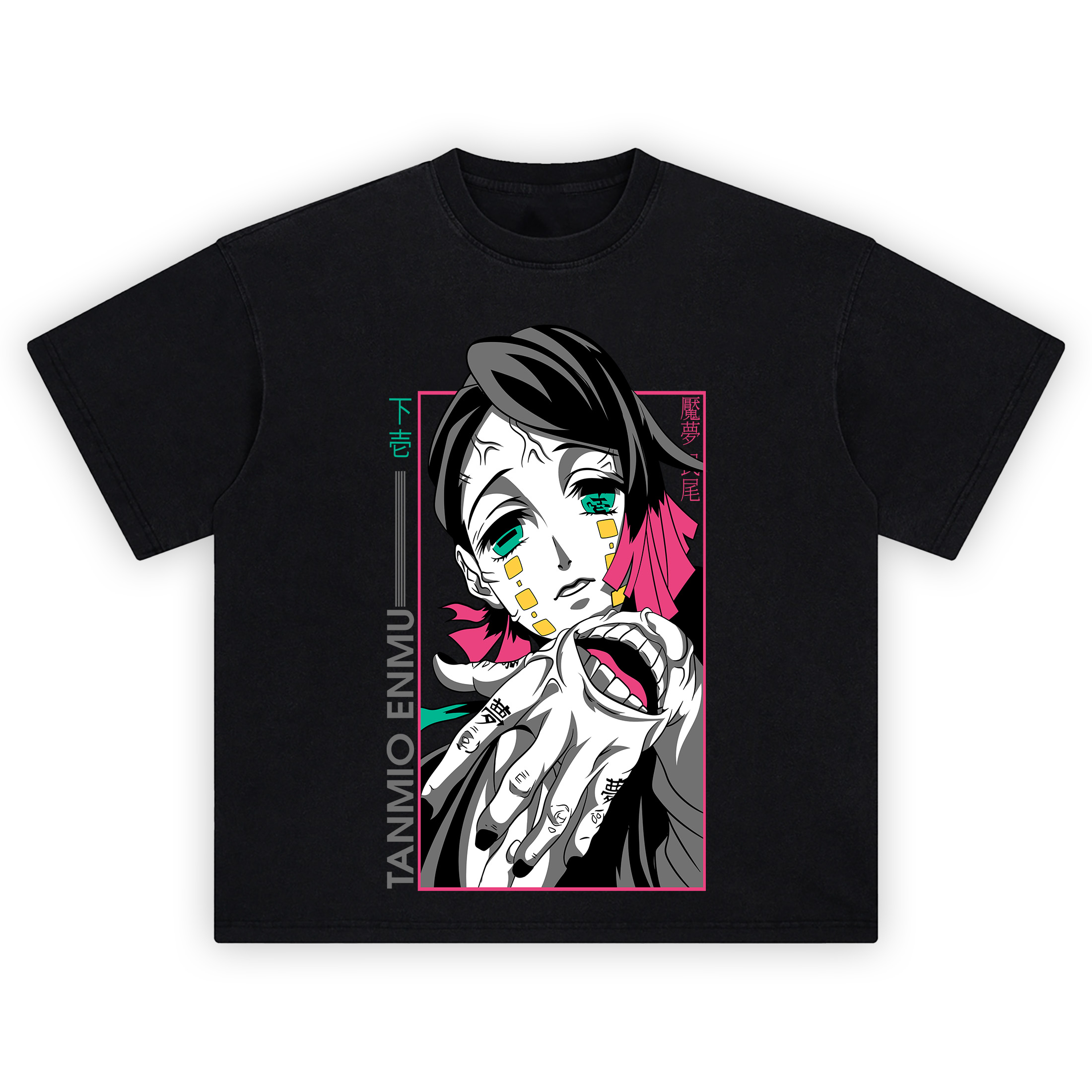 Step into the haunting realm of dreams with the Tanmio Enmu Demon Slayer T-Shirt. Featuring the twisted elegance of Enmu, the Lower Rank One demon from Demon Slayer: Kimetsu no Yaiba, this tee captures his eerie beauty and sinister powers in bold, high-contrast style. His unsettling smile, hypnotic teal eyes, and the grotesque mouth-in-hand detail all highlight his dream-warping abilities. With sharp pops of pink and green against shadowy tones, the Tanmio Enmu Demon Slayer T-Shirt brings cinematic villainy to your wardrobe—perfect for fans who lean into the darker side of the anime universe.
