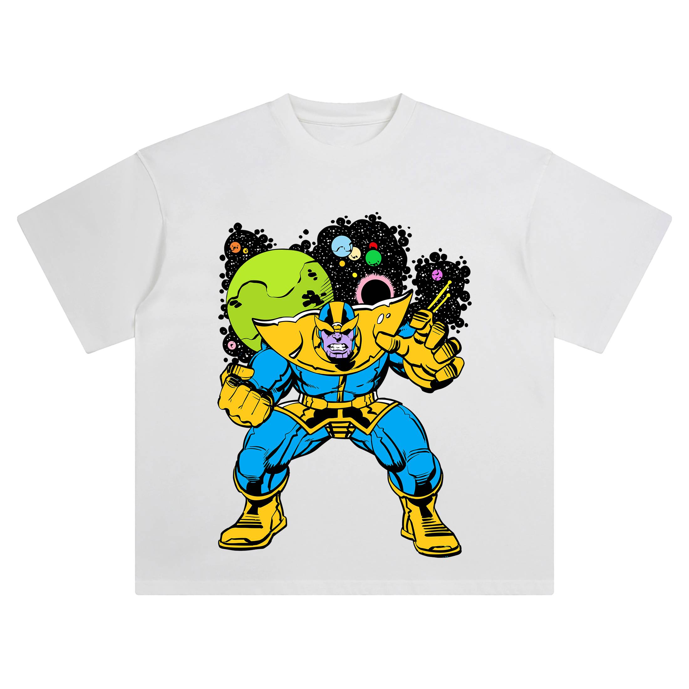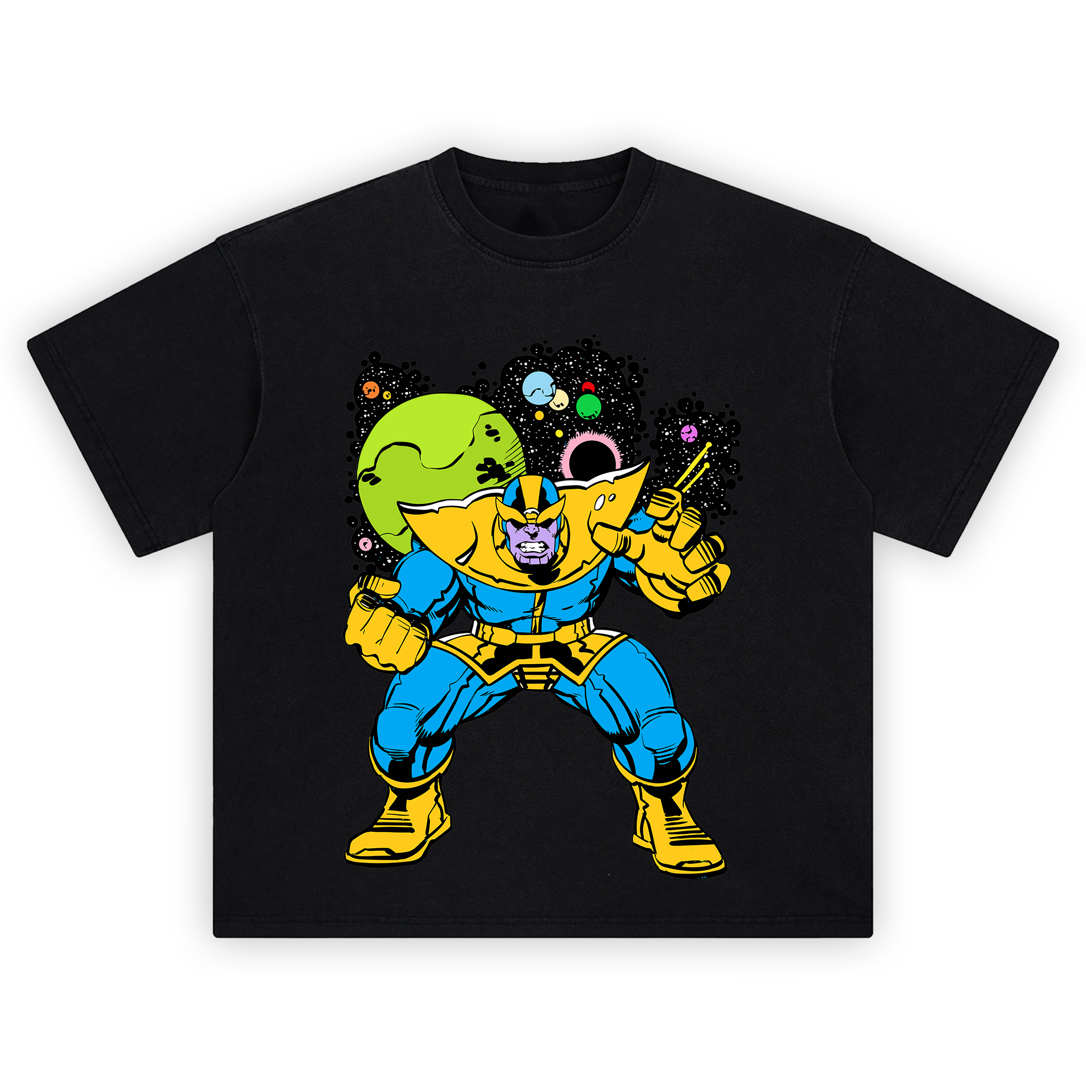 The Thanos Classic Marvel Graphic T-shirt delivers mad titan energy with vintage edge and unstoppable presence. Standing wide with fists clenched and jaw gritted, this throwback design features Thanos in his iconic blue-and-gold armor, bursting from a black space-scape littered with exploding stars and war-torn planets. The cosmic background pops with swirling colors—green, purple, pink, and void—surrounding the villain who sees himself not as evil, but as inevitable. Every detail is crisply rendered in DTG print, giving fans that true collector’s edition feel—in a fit built to flex.