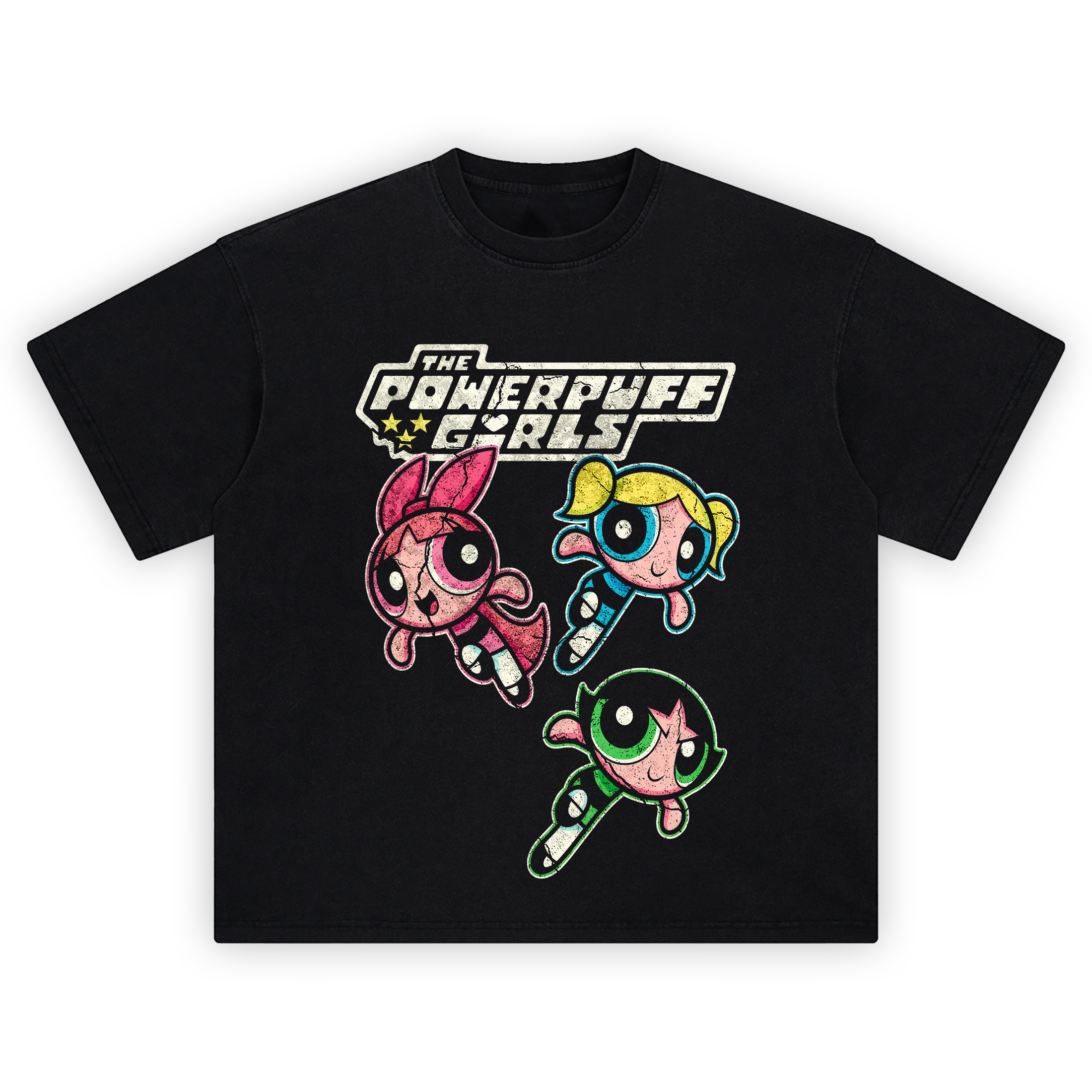 Bring classic cartoon attitude to your lineup with the The Powerpuff Girls Graphic Tee—a bold front graphic built around the iconic trio in motion. At the top of the design, the “THE POWERPUFF GIRLS” logo stretches across in chunky, stylized lettering with a bright light tone and dark outline, giving it a strong, high-contrast look against the black tee. A small set of star details sits near the left side of the logo, adding a punchy accent without cluttering the layout.