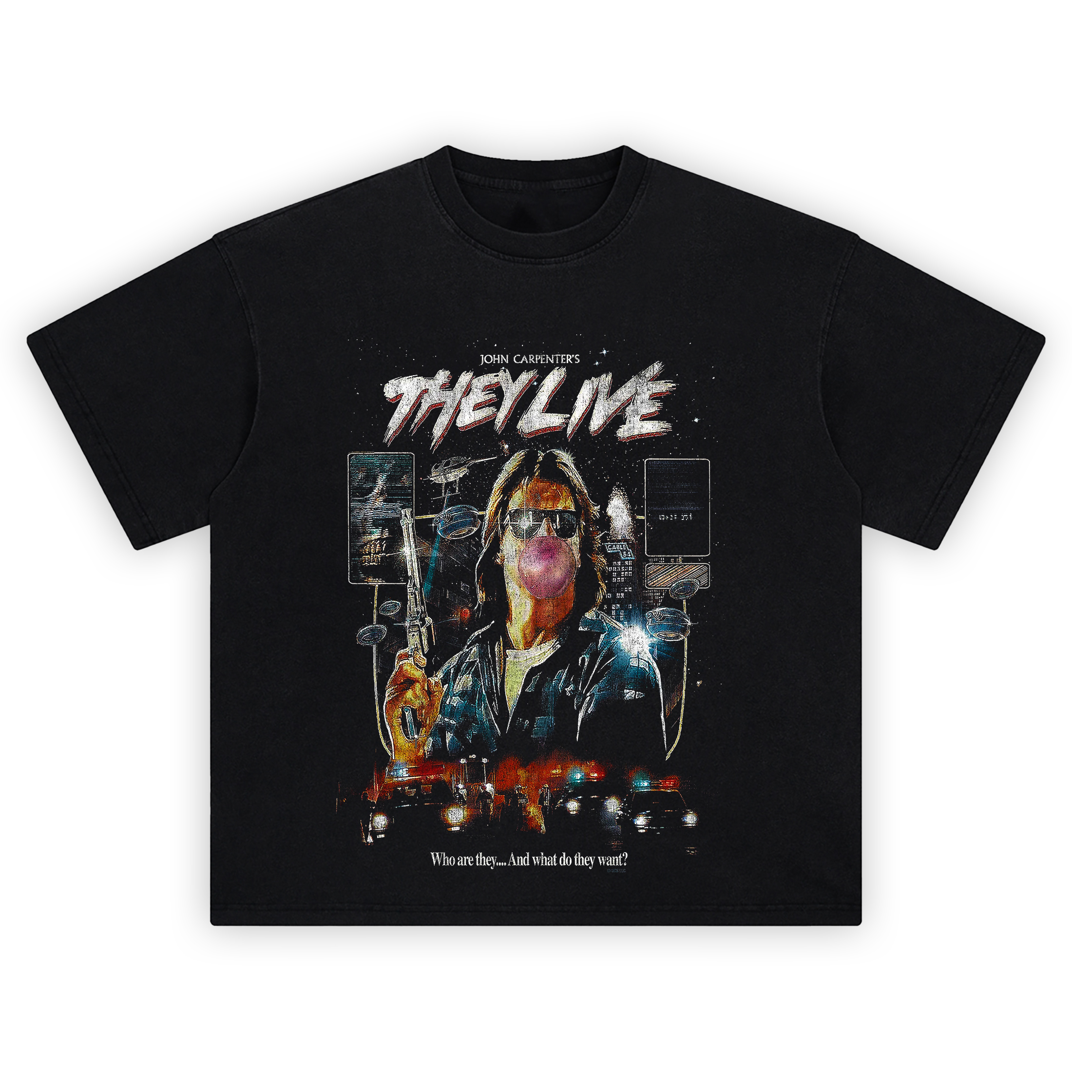 Reveal the truth with the They Live 80s Sci-Fi Dystopia T-Shirt โ a striking tribute to John Carpenterโs legendary cult classic. This design captures the moment of rebellion: Rowdy Roddy Piper front and center, armed, shades on, and bubblegum in full pop โ ready to fight subliminal control with iconic defiance.