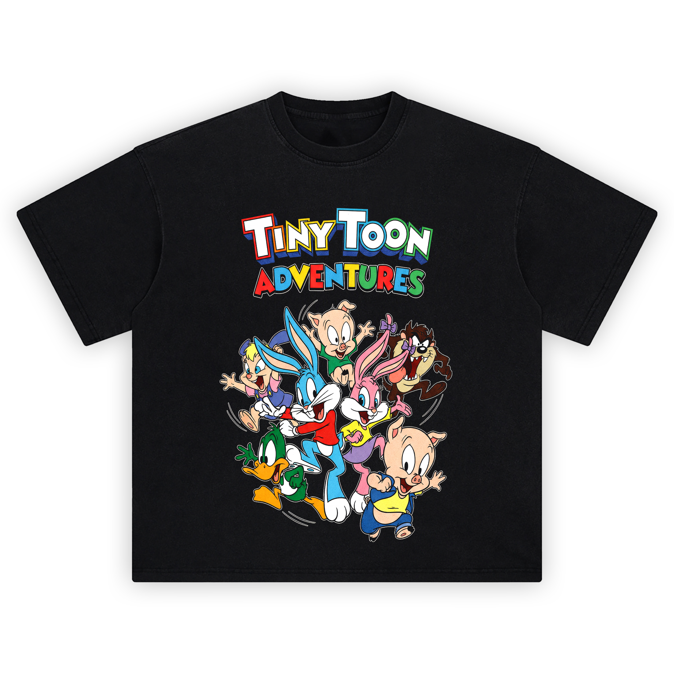The Tiny Toon Adventures Graphic Tee features the colorful “TINY TOON ADVENTURES” logo above a stacked running scene of classic Tiny Toons characters on the front.