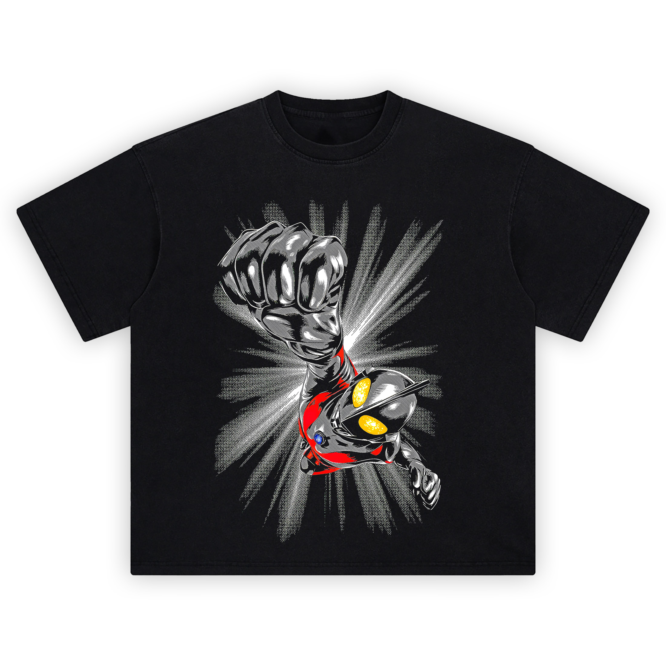 DTG-printed Ultraman Meteor Fist Tee graphic with halftone blast rays