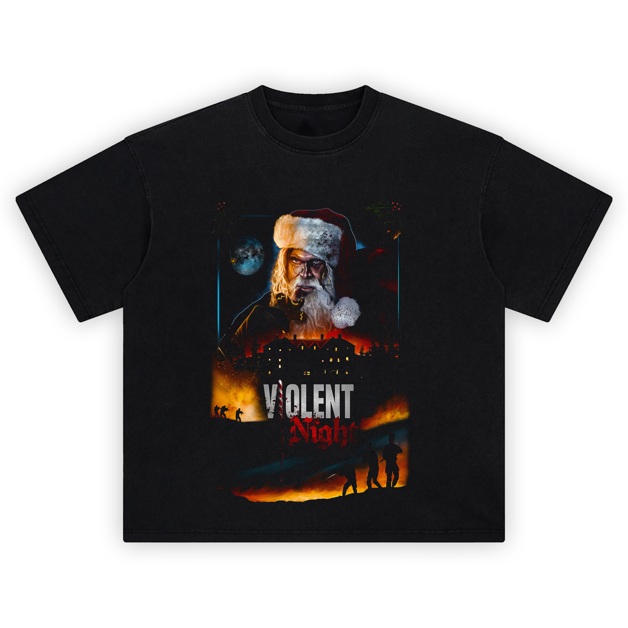 When Santa trades jingle bells for bloodshed, you get the Violent Night Killer Santa T Shirt. This badass holiday horror tee features a brutal, battle-hardened Santa clutching a bitten gingerbread man, ready to turn the season of cheer into a night of vengeance. Explosions light the snowy sky, soldiers descend on a mansion, and “Silent Night” becomes a distant memory.
