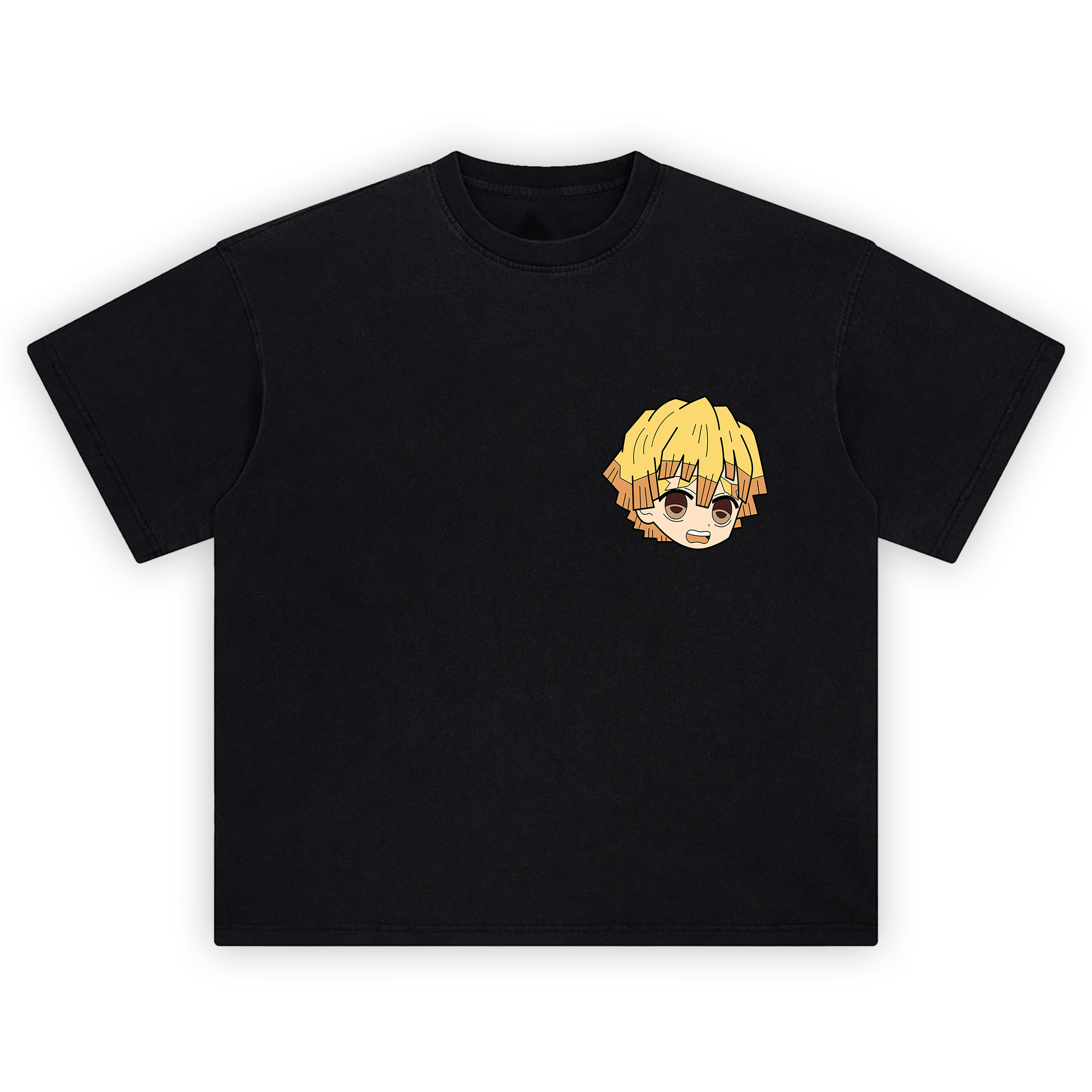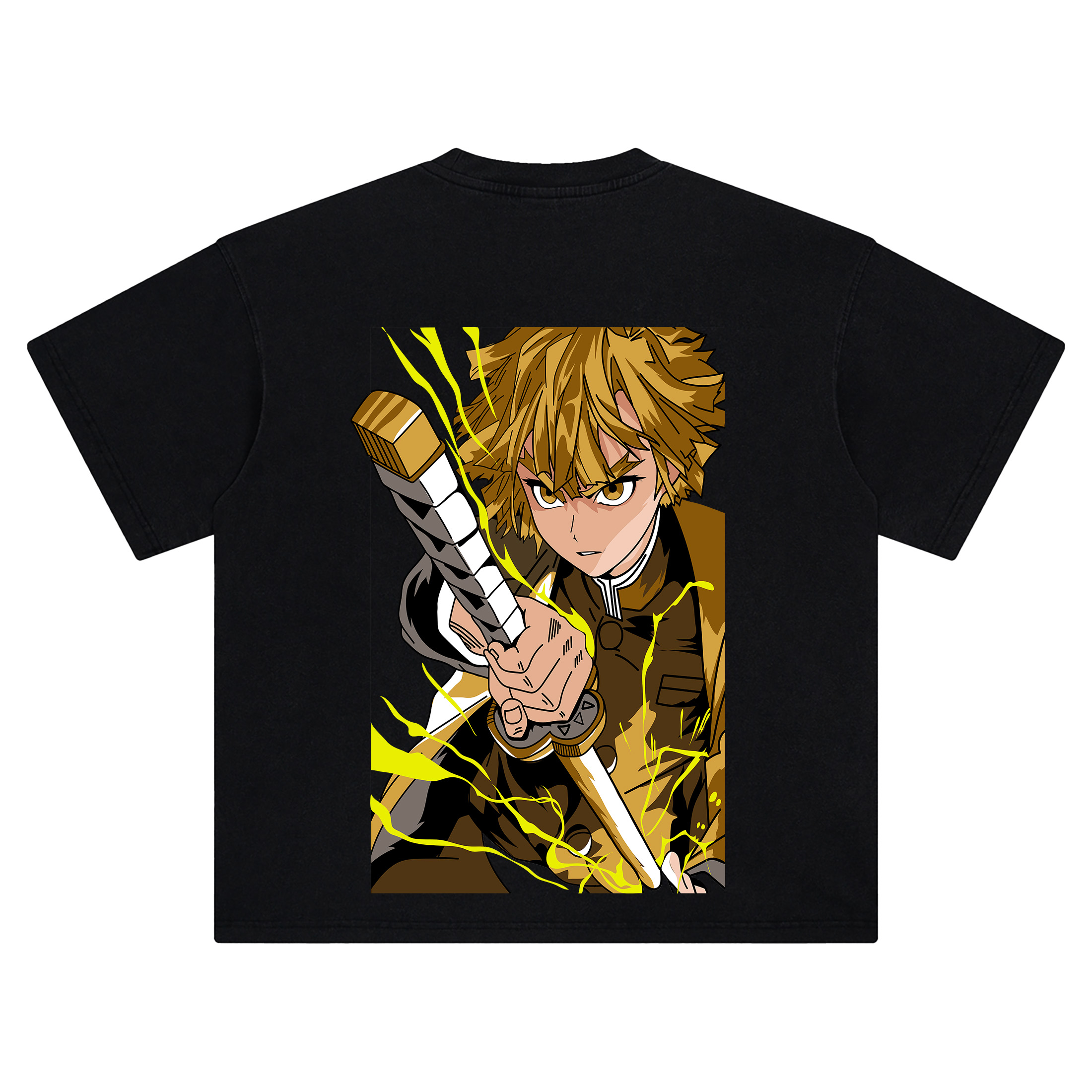 The Zenitsu Thunder Breathing shirt hits with pure Demon Slayer energy. Up front, a tiny left-chest chibi of Zenitsu Agatsuma—messy blond bowl cut, wide anxious eyes, and that unmistakable pout—keeps things playful. Turn around and the back goes full shonen: Zenitsu in his brown Demon Slayer uniform, jaw set and eyes narrowed, driving his Nichirin blade straight toward the viewer. The sword’s rectangular, checker-grip hilt is clear, and crackling yellow lightning ribbons coil across the composition—an on-point nod to Thunder Breathing. Clean vector lines, heavy black fills, and warm gold tones amplify the motion, framing Zenitsu inside a portrait panel that reads like a manga splash page.